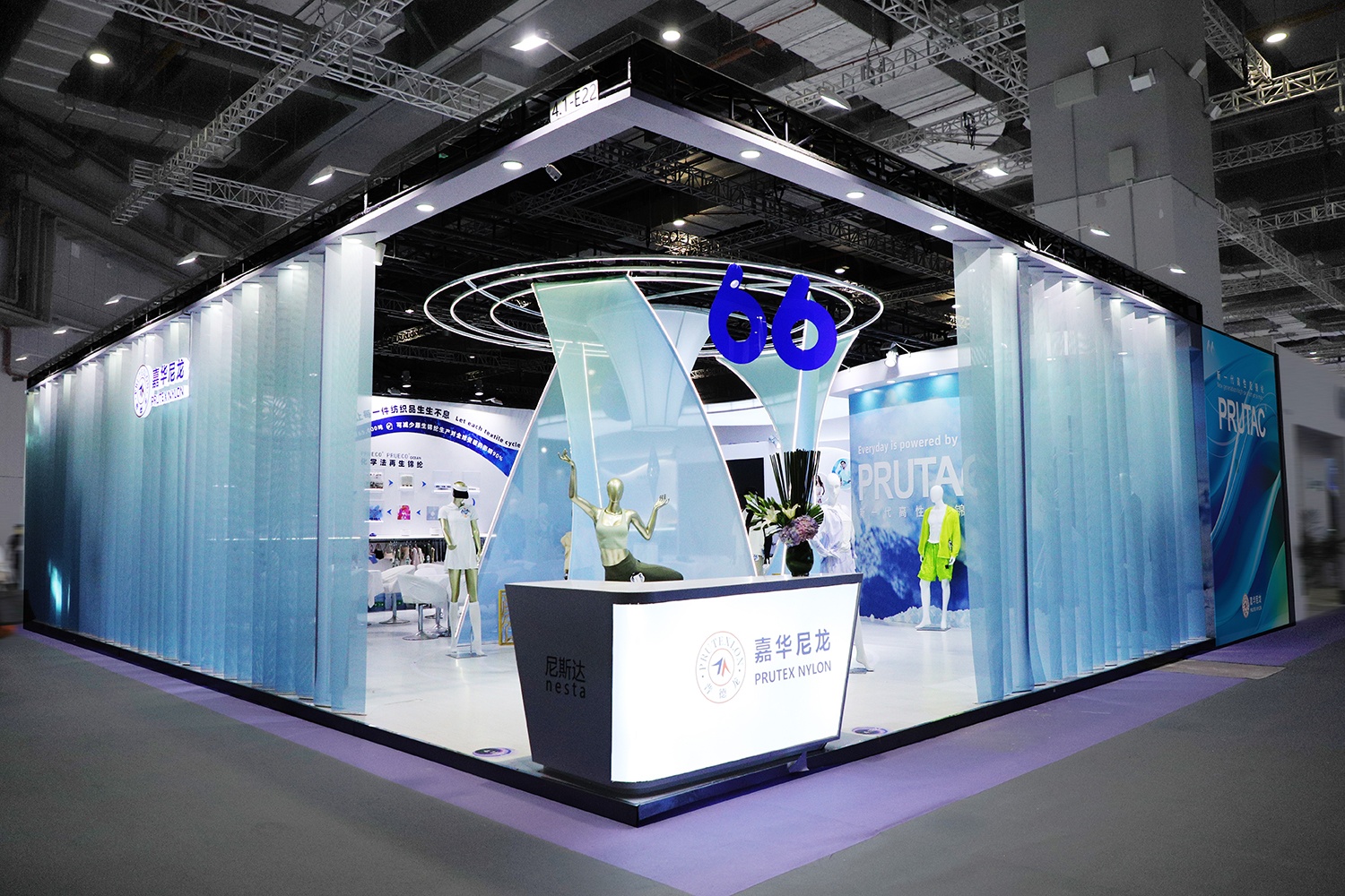 嘉華尼龍本次展臺(tái)以上古神獸-鳳凰的五彩羽毛為靈感,旨在通過(guò)絲縷重疊、通透玲瓏的展臺(tái),呈現(xiàn)如鳳羽般舒適、輕量、強(qiáng)韌、色彩飽滿(mǎn)的嘉華錦綸纖維。嘉華新一代高性能錦綸PRUTAC 色澤飽滿(mǎn)、輕盈雅致、柔軟舒適又堅(jiān)韌無(wú)比,帶來(lái)全新的面料體驗(yàn)。嘉華尼龍?jiān)偕\綸品牌PRUECO 傳遞環(huán)境友好理念,是踐行綠色低碳理念的最好體現(xiàn)。