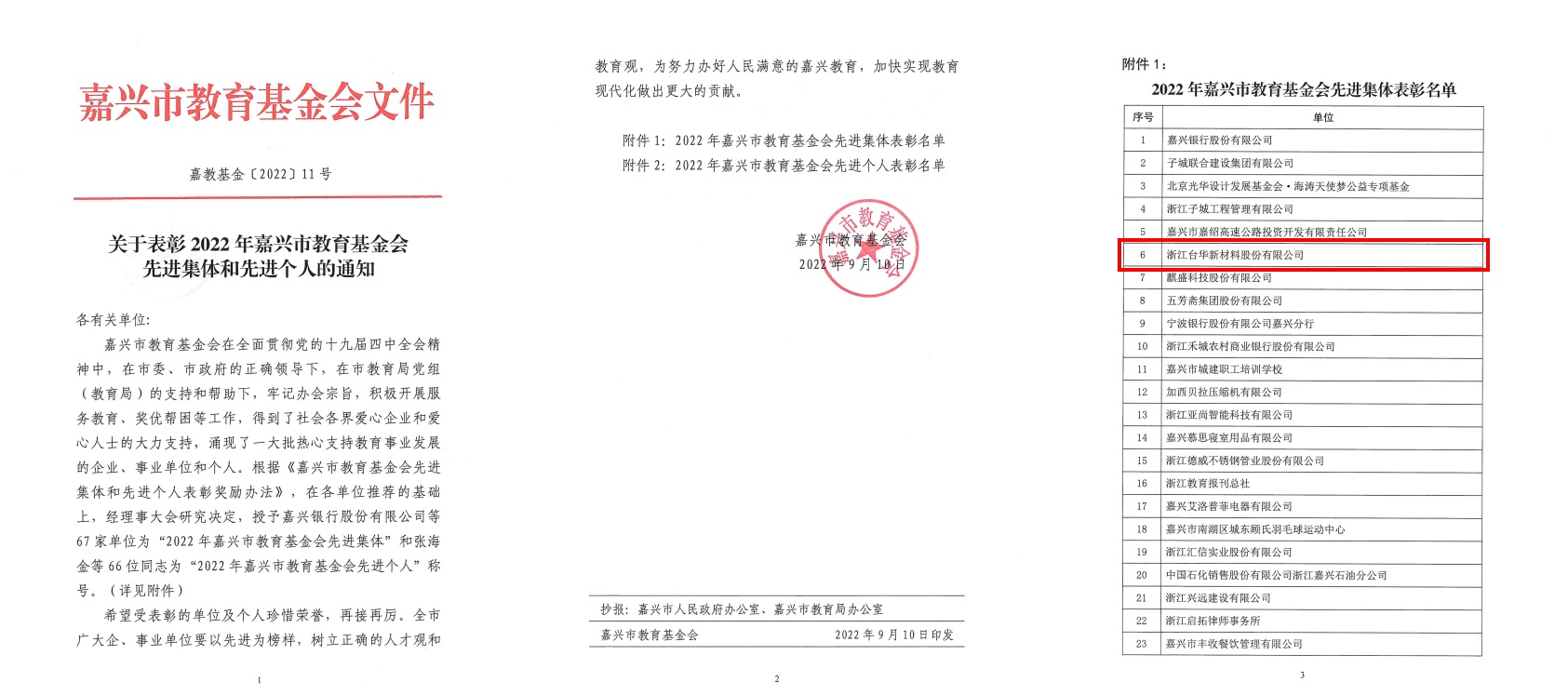 2016年、2021年臺華分別和嘉興市教育基金會簽訂捐贈協議100萬元,用于獎勵當地中小學德智體美勞全面發(fā)展的優(yōu)秀學生