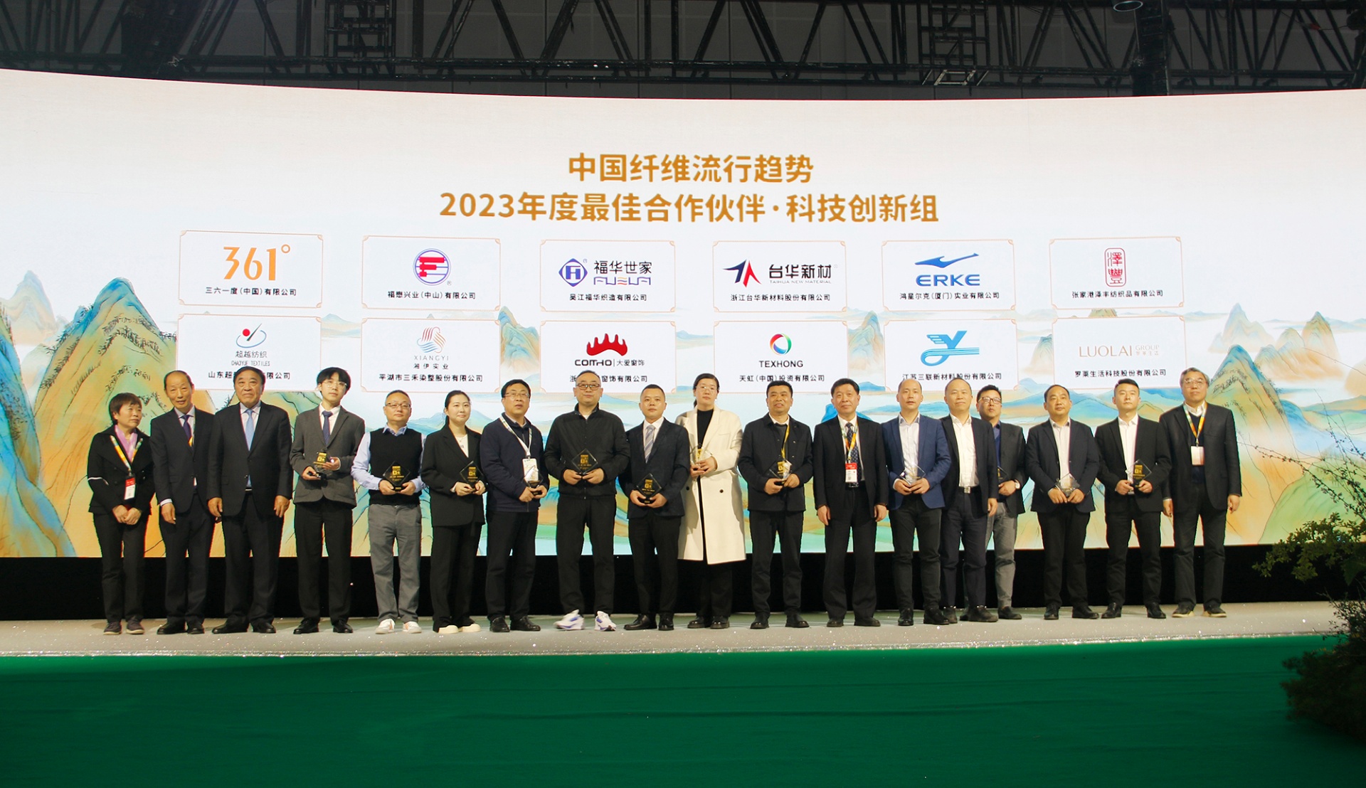 3月28日,上海國家會展中心,桐昆·中國纖維流行趨勢2023/2024發(fā)布會期間,為表彰在纖維制品創(chuàng)新開發(fā)與推廣等方面工作成績突出的下游企業(yè),特別頒發(fā)“最佳年度合作伙伴獎”,共有24家企業(yè)上榜,臺華新材及福華世家獲評科技創(chuàng)新組的2023年度最佳合作伙伴。